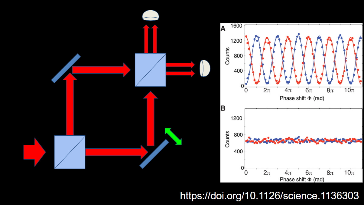 Well, if you look back at the Mach-Zehnder interferometer, I said that if the photons behaved like classical particles, with a definite position, you would expect 50% of them at each detector all the time. You’ll notice a figure labeled “B” on the right side of that image that does just that: no matter where the mirror is moved, each detector sees the same number of photons (more or less).