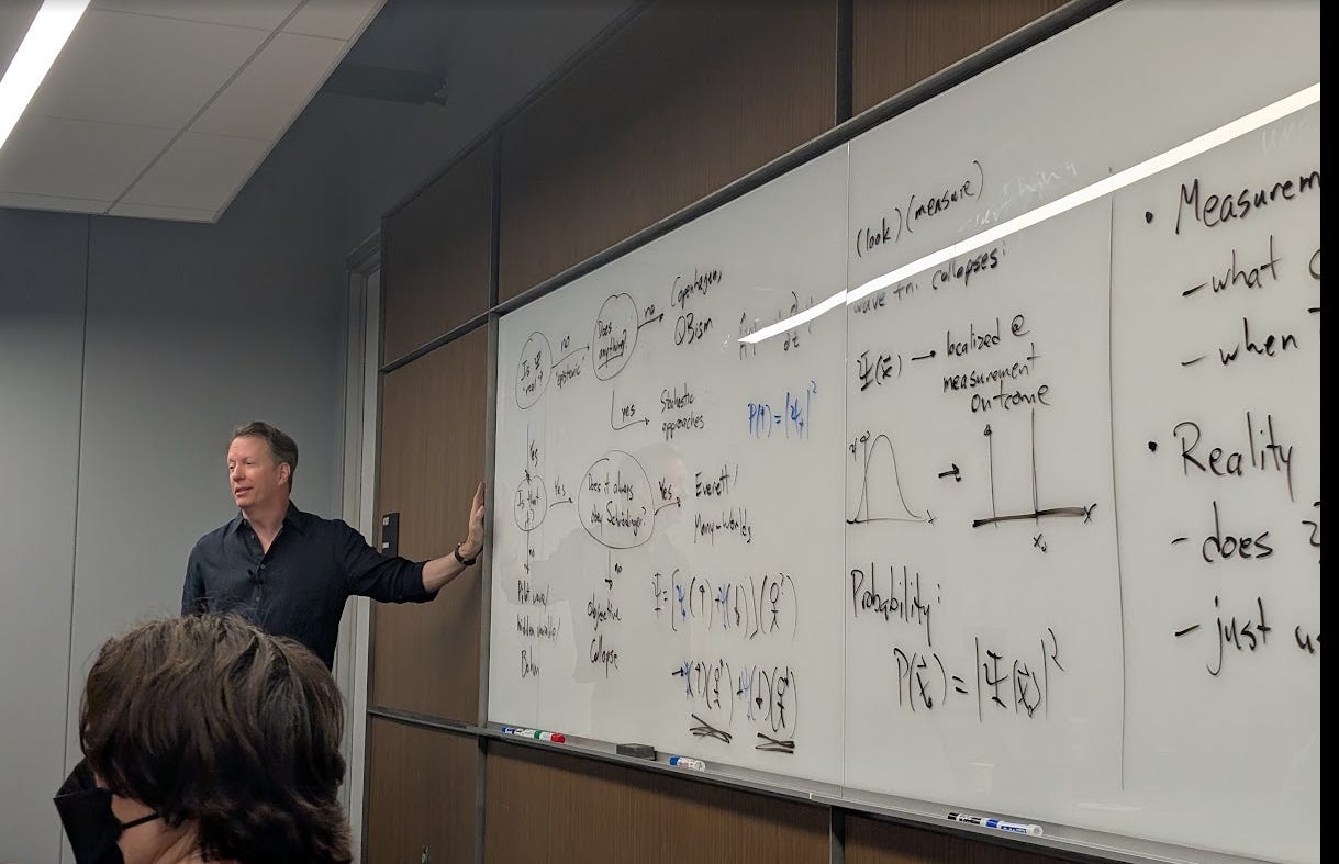 We had around 30 attendees and ten speakers for a full day of talks Thursday, some talks and panel discussions on Friday, and a round of lab tours, with coffee breaks and meals covered thanks to a grant from the American Physical Society’s Innovation Fund. Saturday morning, we invited Sean Carroll down from Johns Hopkins to talk about quantum foundations and answer very general questions from the group.
