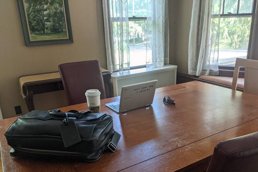 We’re coming up on a time when I’m once again going to need a place to do work that is neither Chateau Steelypips nor my office on campus. I used to use the Starbucks in Niskayuna for this, but during the pandemic they converted the bar area that was my regular seat into the pick-up area for mobile orders, so I need a new option. Accordingly, I spent a few mornings this week testing out one of the rooms in the faculty house (seen in the photo), which I think will serve the purpose I need it to.